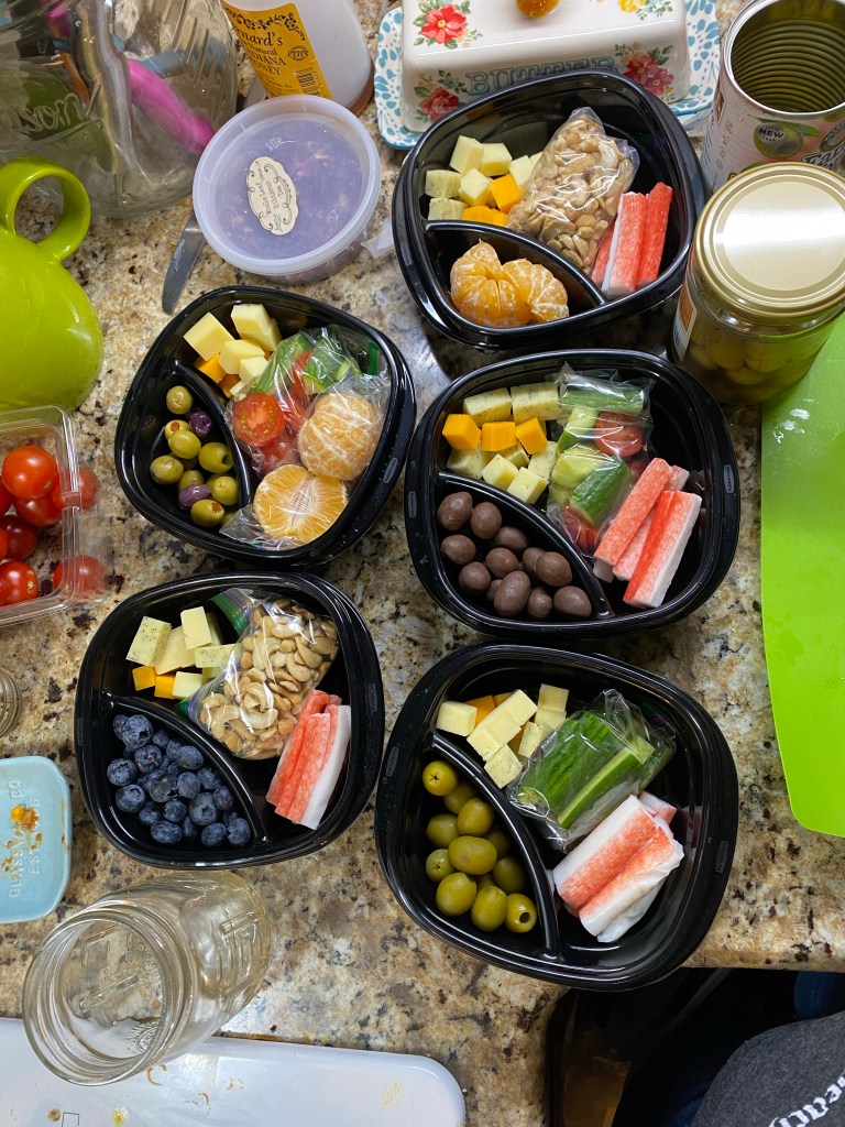 I try to include protein (imitation crab or turkey sticks), a fresh fruit or veggie (berries, clementines, tomatoes, or cucumbers), two or three types of cheese, and a sweet or salty random addition. I’m on week three and I really love it. I feel so much better and less physically exhausted at the end of the day. I’ve also started trying to drink more water but that’s still a struggle. I’ve been stretching in the mornings too and including the kids on weekends.