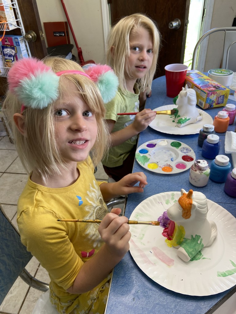 The truth behind the photo: When I took this picture I’d recently become unemployed and the kids hadn’t started school yet. I bough these cute ceramics at Walmart and pulled out the poster paint because they were driving me insane and I needed them to leave me alone for a little bit so I could get some things done and have a moment to myself. Also, The Hun is painting hers like a Zombie because within minutes of me giving it to her she tripped and it broke. She was heartbroken and cried so I did my best to hot glue it while I felt (irrationally) guilty because “I should have carried it to the table for her.” After she calmed down we were able to joke and she settled on a Zombie motif. Now it’s one of my favorite Halloween decorations. Can’t get much better than a Unicorn Zombie right?