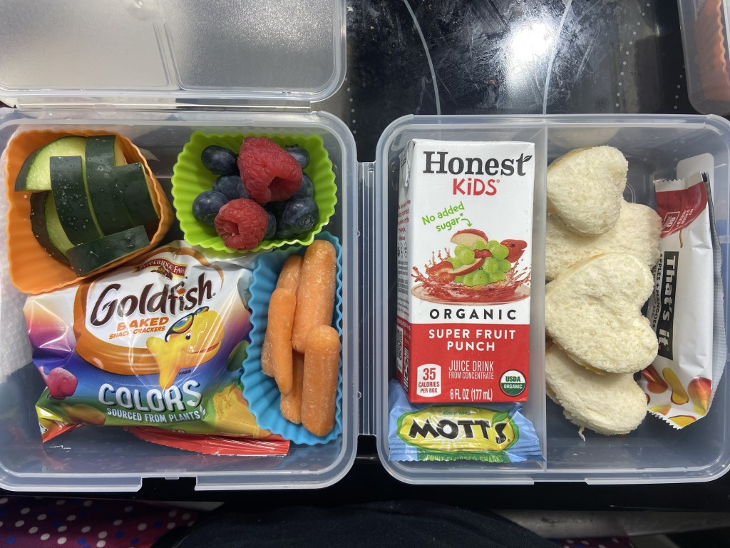The truth behind the photo: I love packing their lunches because it gives me an opportunity to be creative with a task that I already have to do. I started packing my kids lunches to save money because I’m not bringing in a regular income right now. I also have time to do this because I’m not working much. If I was still working my last job there’s no way I’d pack them lunch let alone a pretty one. One kid frequently complains about her lunch because she wants to eat cafeteria food like her friends. My parents were kind enough to supply us with goldfish and juice boxes to help me save money and give the girls things they like.