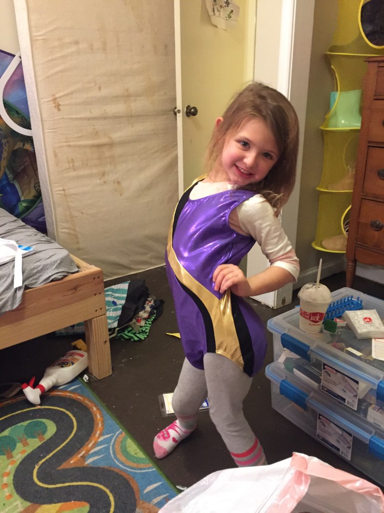 Crazy Eyes wants to wear her new leotard 24/7. Daddy bought it for her on their Daddy daughter date a week ago and I’ve had to fight her to take it off ever since. She keeps it not in her drawer, but in the treasure box that her Grandy made for her. When I asked her about it she said, “yeah, it’s treasure!” Right as I opened my mouth to remark on how sweet that was she followed it up with, “my underwear is treasure too!” and a big grin. I had to explain to her that dirty underwear belongs in the laundry basket not in her treasure box.
